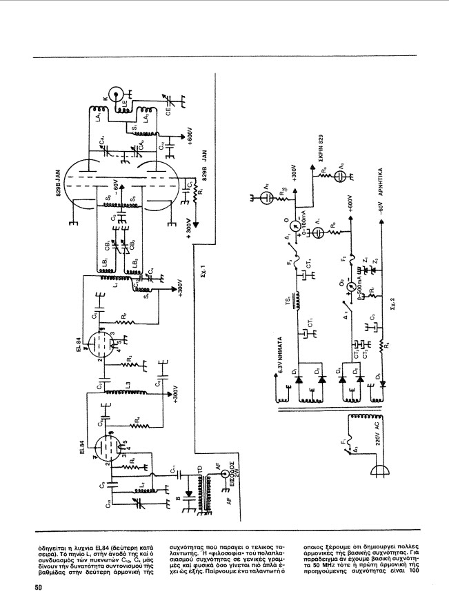 Schematics of pirate radio FM transmitter with 829B from an old Greek electronic magazine. Oscillator and driver are EL84 (6BQ5) at 300V. It would be better to use some little triode like oscillator EC900 6HM5, powered by stabilized voltage, than buffer, and finally driver with EL 84 (6BQ5). Anyway, this oscillator can work very stabile.